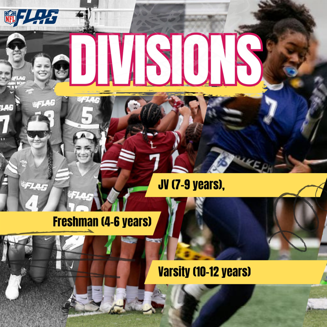Three divisions for all skill levels: Freshman (4-6 years), JV (7-9 years), Varsity (10-12 years).